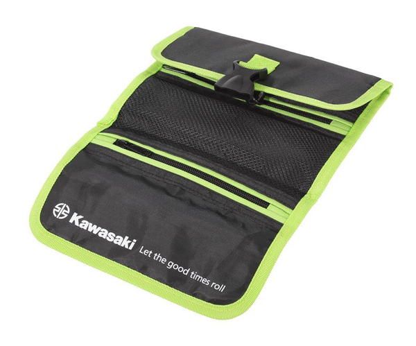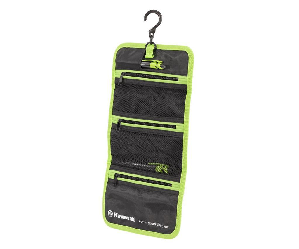 Roll-up toiletry bag with hook and three zipped compartments. Open dimension: 21cm wide x 40cm long
