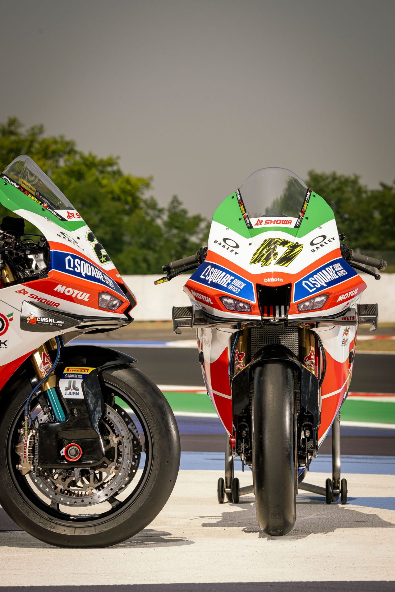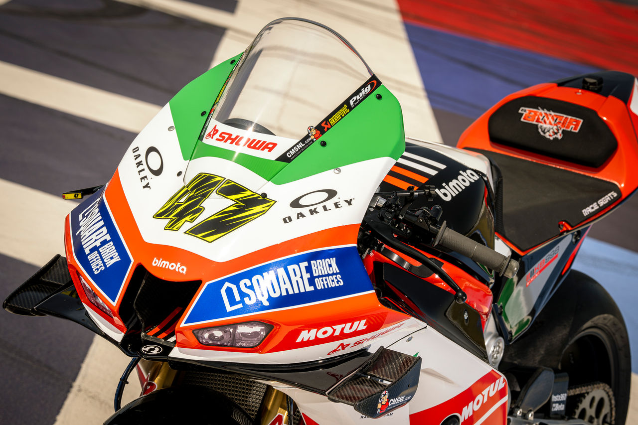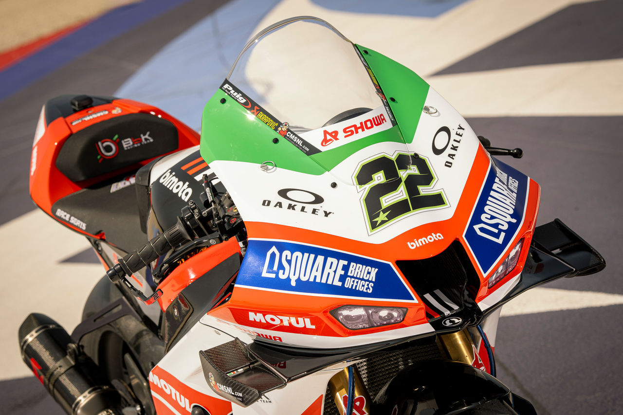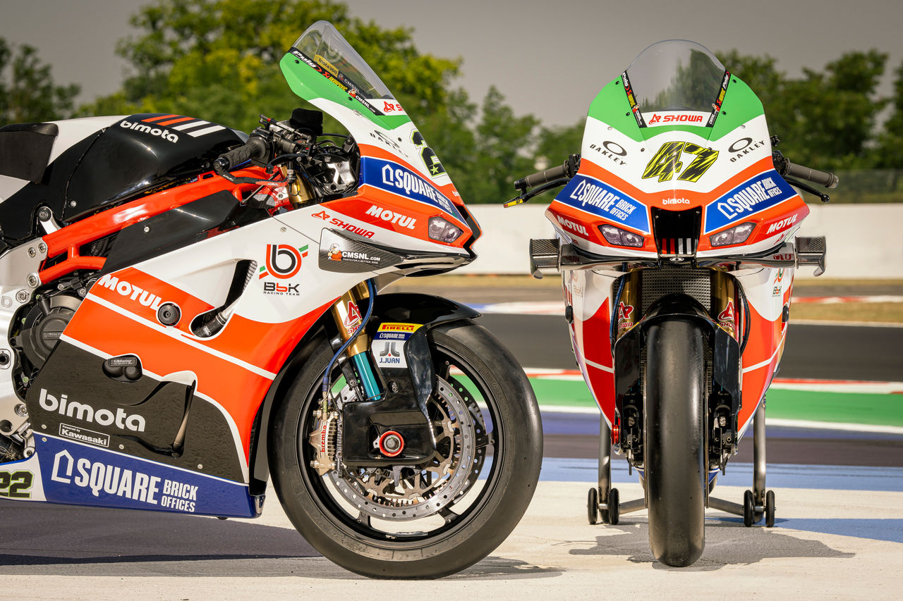 This celebratory bike and rider colour schemes at Misano makes an even more striking impact for the already highly visible bimota WorldSBK project, which has already earned top five race finishes for regular riders Axel Bassani and Alex Lowes.